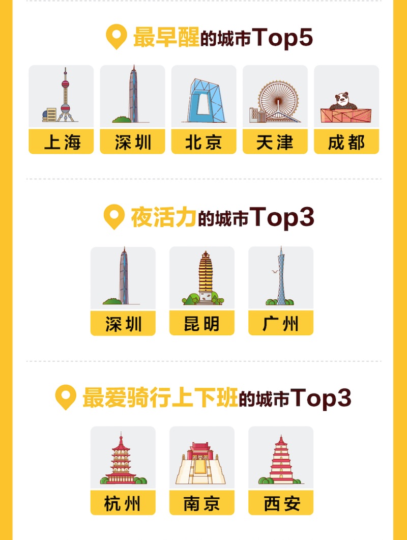 “骑迹焕活城市”陈述显现,3月以来,全国首要城市的骑行迟早顶峰康复正常,其间上海、深圳每天“醒”得最早,早顶峰从清晨5点开端,北京、天津、成都紧随其后,早顶峰始于6点;杭州、南京、西安的迟早顶峰骑行用户占比最高,成为自行车轮上的复工城市;深圳、昆明、广州因深夜和清晨骑行人数占比高于其他城市,成为骑行“不夜城”;值得一提的是,最早“醒”的深圳一起也最晚“睡”,是“焕生机”最强的城市。