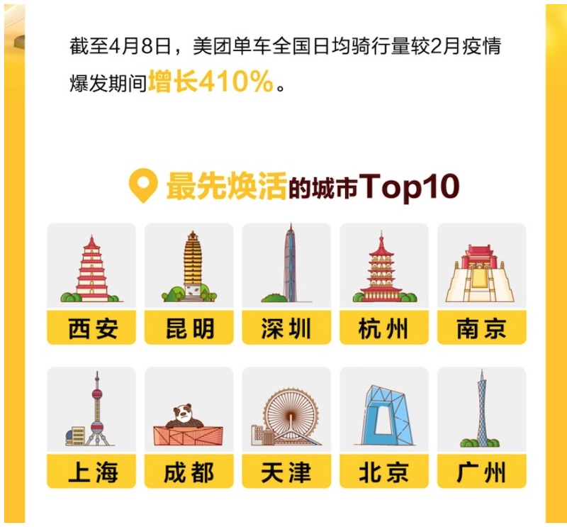 陈述显现,到4月8日,美团单车全国日均骑行量较2月疫情迸发期间增加410%。焕活最快的城市前十位分别为西安、昆明、深圳、杭州、南京、上海、成都、天津、北京和广州,其间,西安的美团单车骑行数据在3月底便已彻底康复至疫情前水平,昆明、深圳、杭州也于4月8日前回归正常。